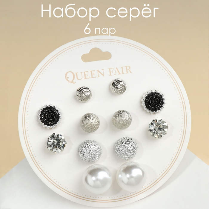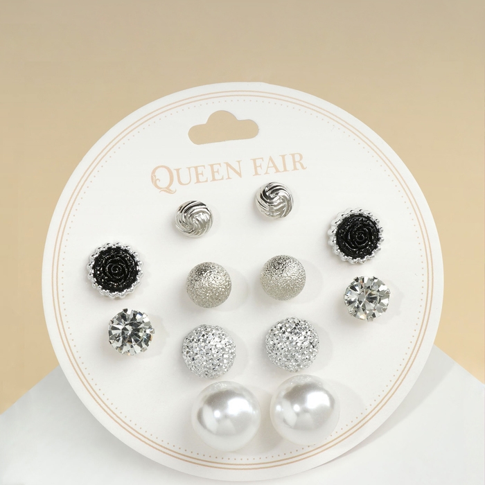 Пусеты 6 пар «Жемчужные» шары, цвет чёрно-белый в серебре