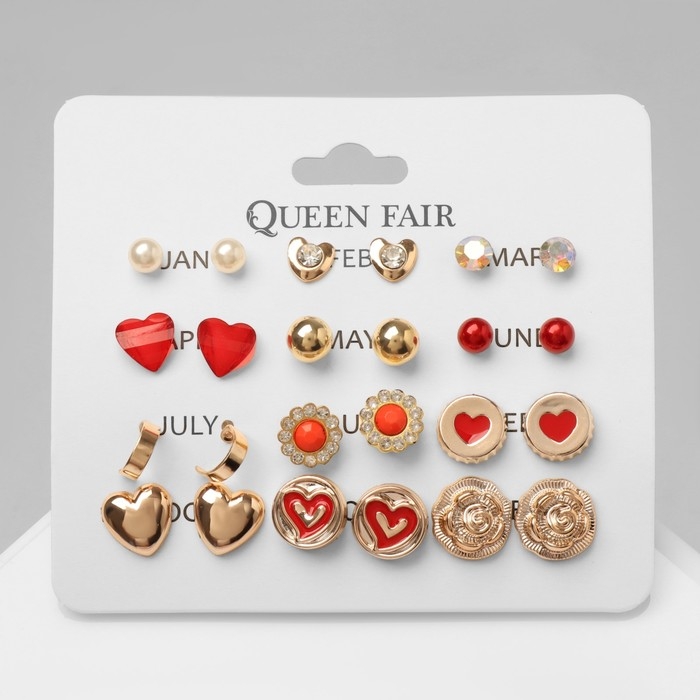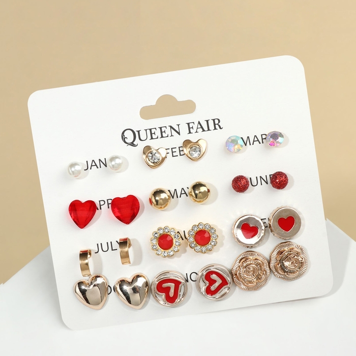 Пусеты 12 пар «Фантазия» сердечки, цвет красно-белый