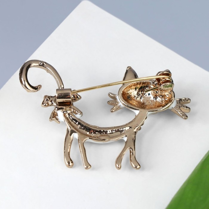 Брошь «Кошка» кокетливая с бантом, цвет белый в кофейном золоте
