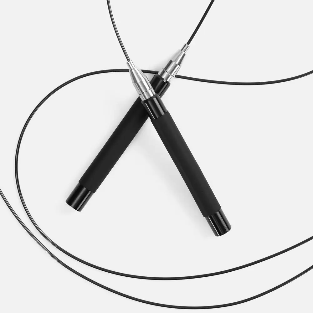Легкие эргономичные алюминиевые ручки обеспечивают удобный захват, а полиуретановое покрытие предотвращает выскальзывание. Трос с сердцевиной из стального кабеля с гладкой оплеткой из ПВХ не запутывается при скоростном кручении, обеспечивая высокий контроль и управляемость. Система поворотных подшипников, установленная в ручках скакалки, обеспечивает равномерное вращение шнура на 360°.