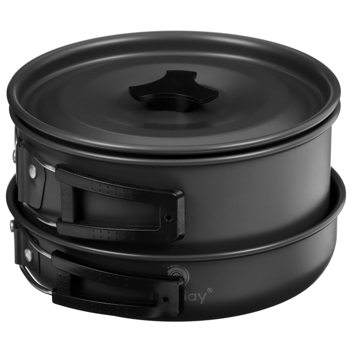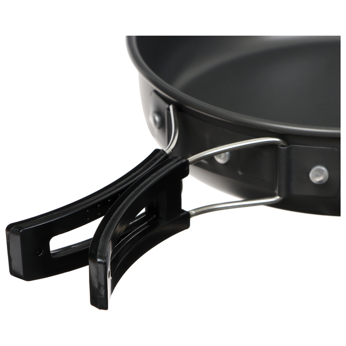 Набор походной посуды из анодированного алюминия позволяет соединить в себе приготовление еды и напитков. Имеет откидные переносные ручки с термоизолирующим покрытием, которые экономят объем при транспортировке, делая использование посуды более комфортным.