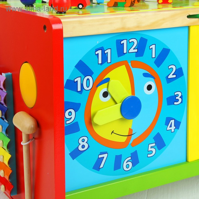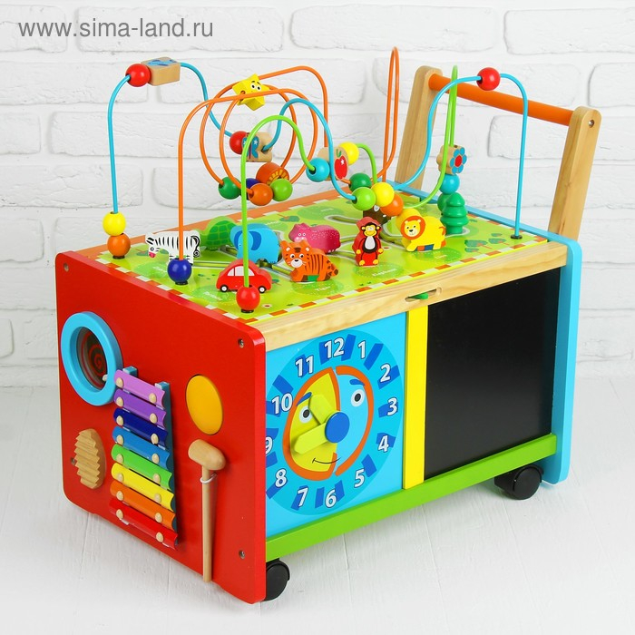 У логического центра множество игровых поверхностей с разными модулями (лабиринт с животными + серпантинка, металлофон, часики, сортер + счётное деревце). Отличительной чертой является формат каталки: благодаря колёсам и ручке кроха сможет перемещать игрушку и сам тренироваться в ходьбе. Логический центр развивает память, моторику пальчиков, логику, расширяет кругозор. Сделан из дерева, окрашен безопасными лаками.
