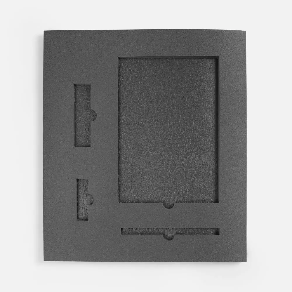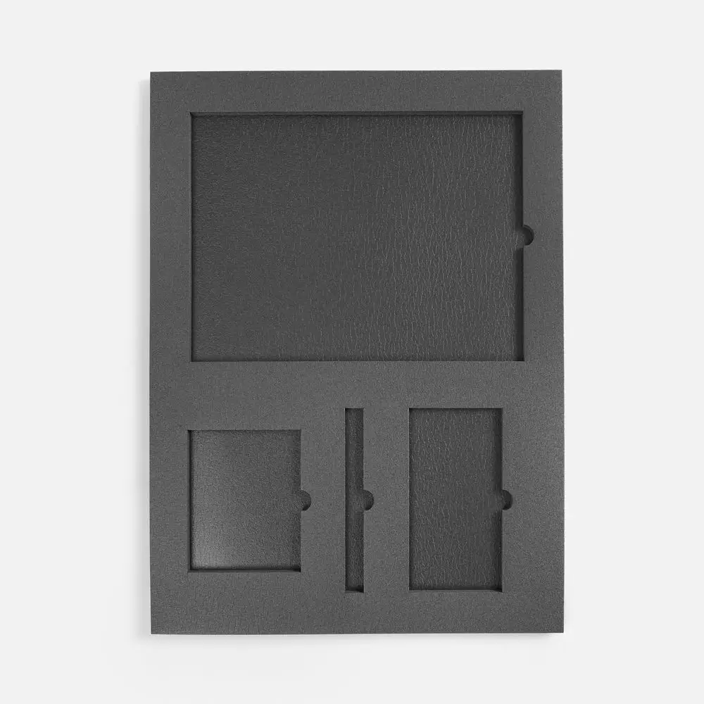 Ложемент, изготовленный из материала Izolon 500 черного цвета, представляет собой многослойную конструкцию, состоящую из нижнего слоя толщиной 5 мм и верхнего слоя толщиной 10 мм. В соответствии с утвержденным макетом, проемы для размещения предметов могут быть спроектированы как в одном, так и в обоих слоях.