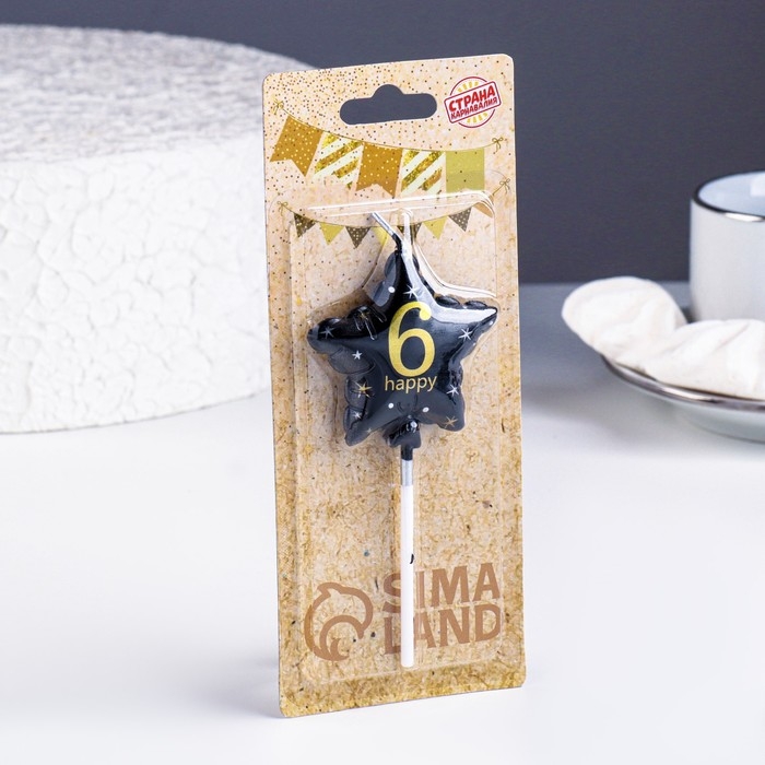 Свеча в торт на шпажке "Воздушный шарик.Звезда", цифра 6, 5,5 см, черная с золотом