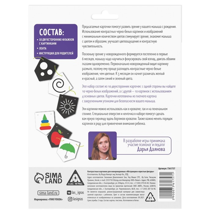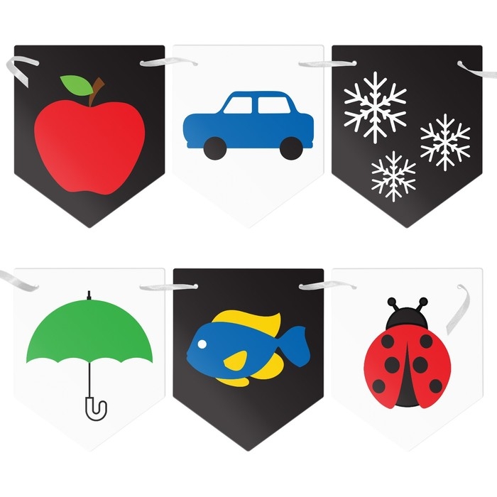 Карточки изготовлены из плотного картона с закруглёнными уголками для безопасности малыша. Эти картинки можно использовать как в кроватке, так и на пеленальном столике. Специальные отверстия на карточках и ленточка в наборе позволяют сделать яркую гирлянду вдоль бортиков кроватки. Также важно периодически менять порядок картинок в ряду для привлечения внимания ребёнка.