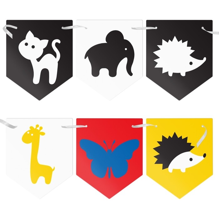 Карточки изготовлены из плотного картона с закруглёнными уголками для безопасности малыша. Эти картинки можно использовать как в кроватке, так и на пеленальном столике. Специальные отверстия на карточках и ленточка в наборе позволяют сделать яркую гирлянду вдоль бортиков кроватки. Также важно периодически менять порядок картинок в ряду для привлечения внимания ребёнка.