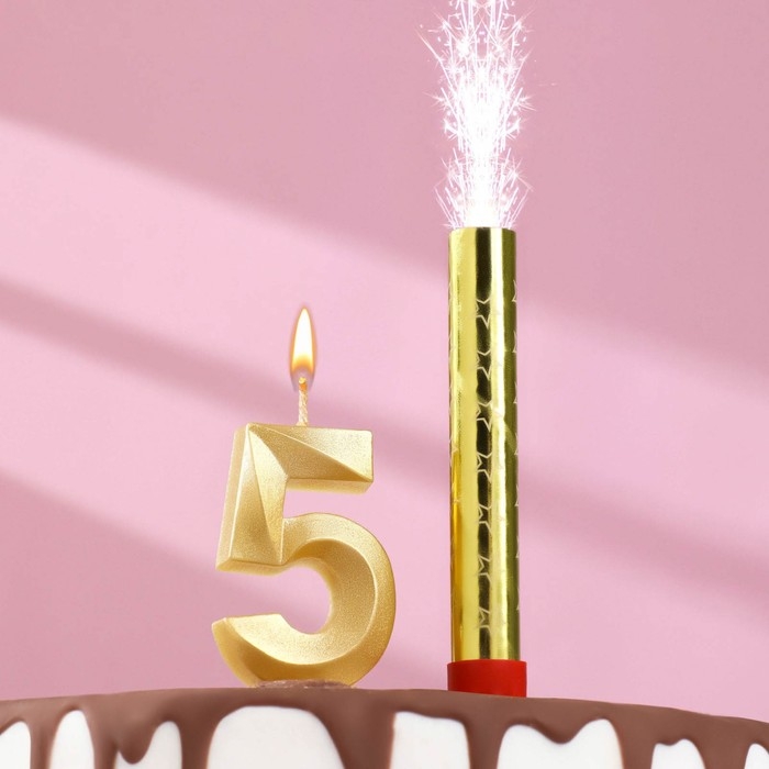 Свеча для торта цифра "Грань + фонтан" золотая "5"