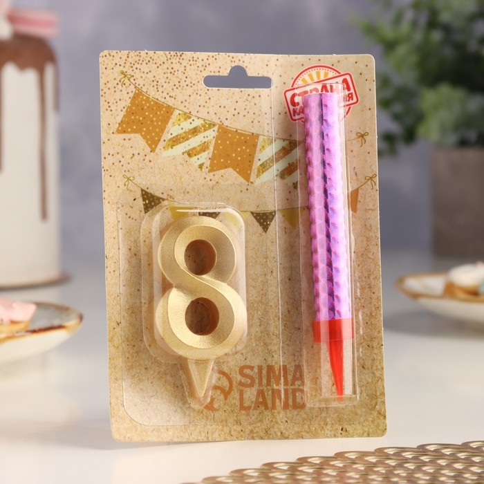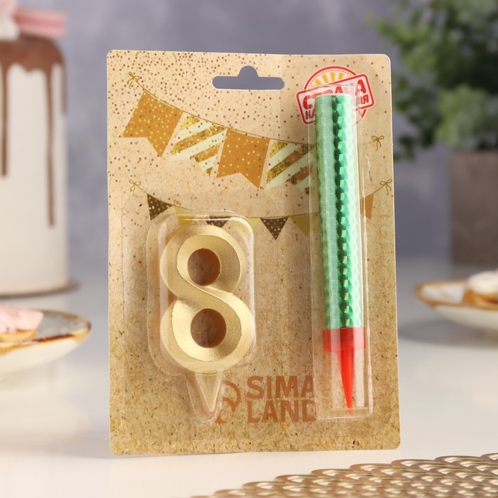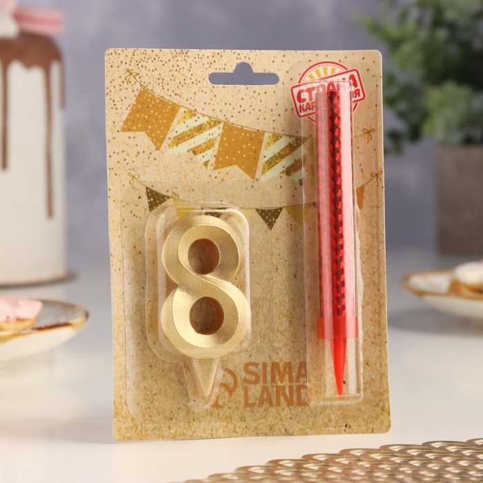 Свеча для торта цифра "Грань + фонтан" золотая "8"