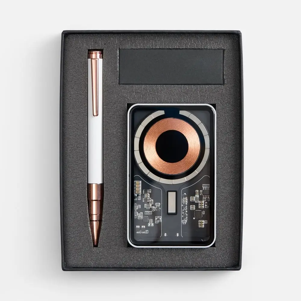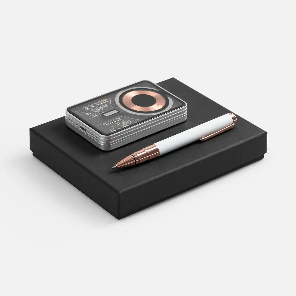 Компактный аккумулятор Cooper Ergo с премиальным корпусом и привлекательной электронной «начинкой» под прозрачной панелью в сочетании с увесистой шариковой ручкой Kugel Rosegold станут идеальным подарком как для коллег, так и для руководителей.