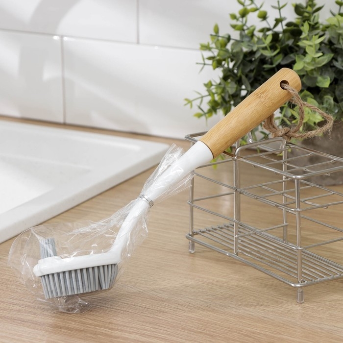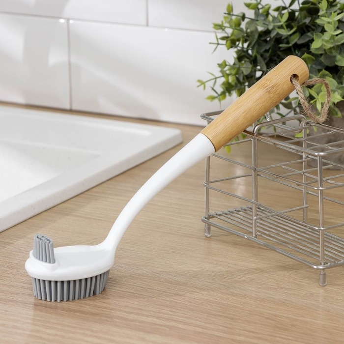 Щётка для посуды Доляна Meli — идеальный помощник для мам и домохозяек! Двухсторонняя бамбуковая ручка обеспечивает удобство использования, а мягкий ворс TPR размером 1,8 см позволяет бережно очищать кастрюли, сковороды, противни и гриль. Благодаря отверстию для подвешивания щётка занимает минимум места на кухне. Купите сейчас и наслаждайтесь чистотой без лишних усилий!