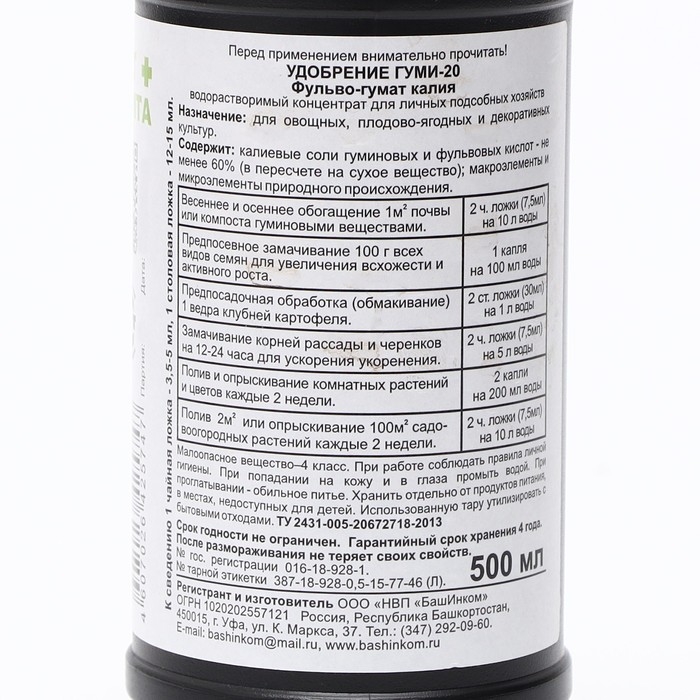 Комплексное питание всех с\х культур в виде корневых и некорневых подкормок, обработка семян перед посевом. Изготовленные из биоактивированных по молекулярному весу калийных солей гуминовых кислот, находящихся в свободной мобильной форме, которые проникают в растения за счет повышения проницаемости клеточной мембраны и активно включаются в обменные процессы сельскохозяйственных растений, что способствует: