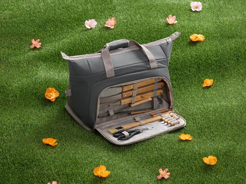 Объемная стильная и эргономичная термосумка вместит в себя все заготовленные овощи и мясные продукты, а также сохранит их температуру до 3 часов. Покрытие с водоотталкивающим эффектом защитит содержимое от внезапного дождя, а продуманная система хранения позволит надежно зафиксировать каждый инструмент в сумке при транспортировке.