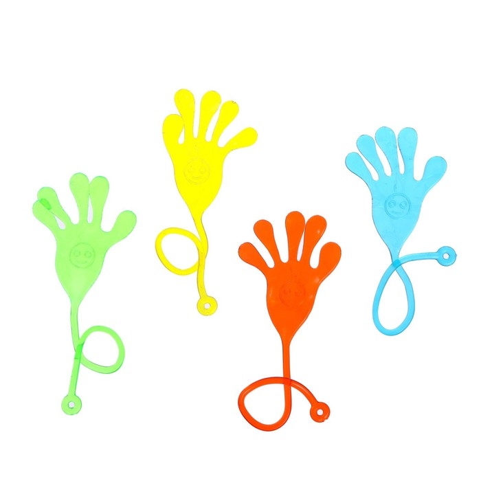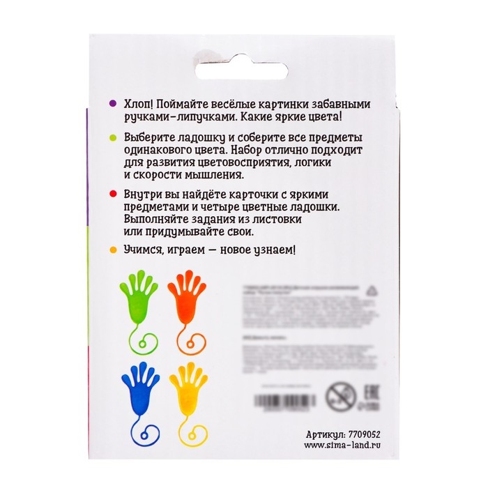 - Задача малыша — собрать предметы одного цвета подходящей липкой ладошкой. Например: зелёной собрать зелёные предметы, жёлтой — жёлтые и так далее.