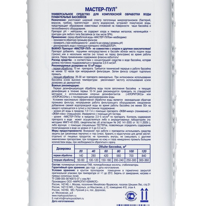 Средство для очистки воды в бассейне "Мастер-пул", универсальное, 1 л
