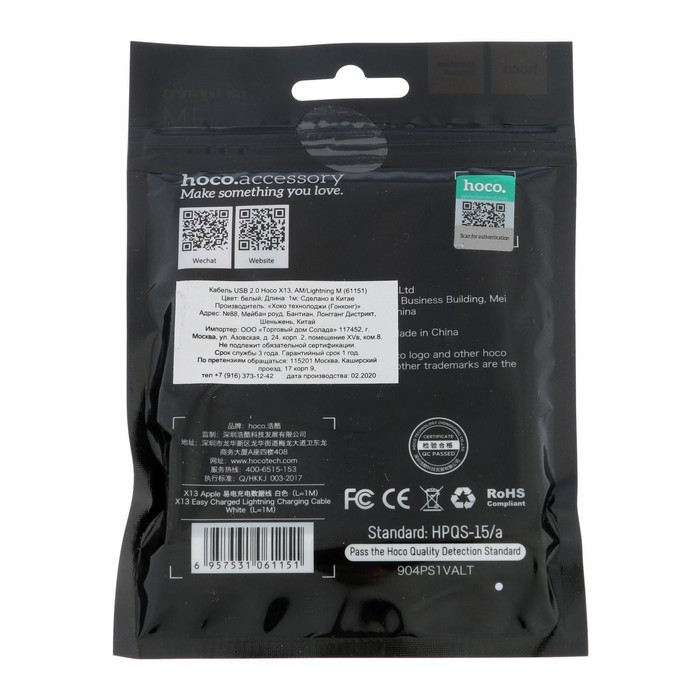 Кабель Hoco X13, Lightning - USB, 2,4 А, 1 м, PVC оплетка, белый