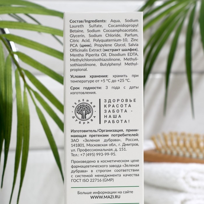 Состав: Aqua, Sodium Laureth Sulfate, Cocamidopropyl Betaine, Sodium Cocoamphoacetate, Glycerin, Sodium Chloride, Parfum, Citric Acid, Polyquaternium-10, Zinc PCA (цинк), Propylene Glycol, Salvia Officinalis Extract (экстракт шалфея), Mentha Piperita Oil, Disodium EDTA, Methylchloroisothiazolinone, Methylisothiazolinone, Butylphenyl Methylpropional