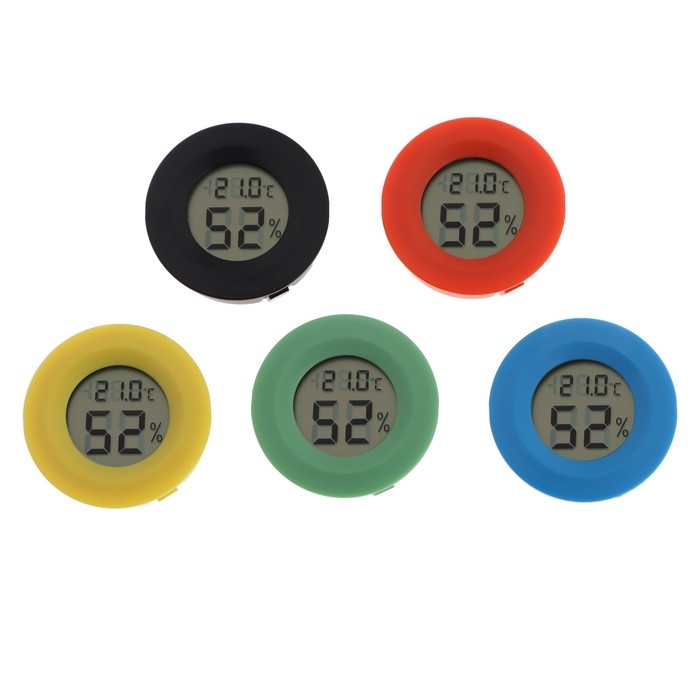 Термометр представлен в нескольких цветах: красный, черный, желтый, зеленый и синий. Работает от батарейки.