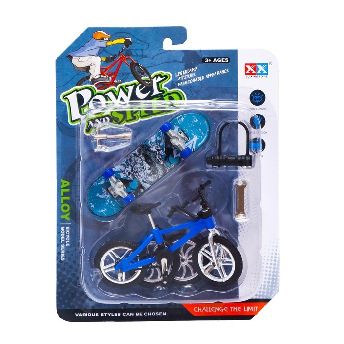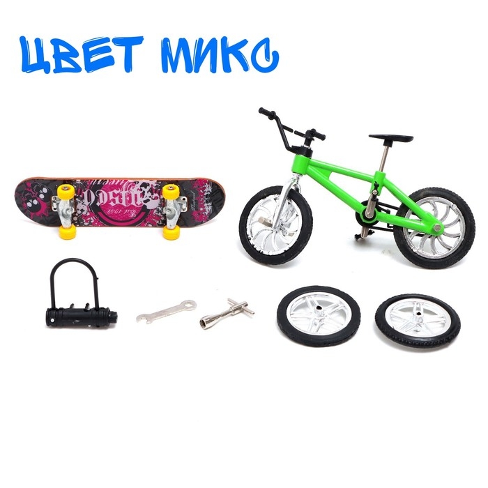 - В комплект входят фингербайк и фингерборд — уменьшенные версии велосипеда и скейтборда.