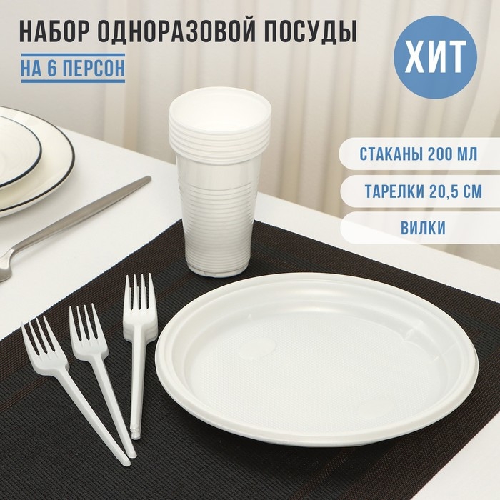 Набор пластиковой одноразовой посуды на 6 персон Не ЗАБЫЛИ! «Пикник», тарелки d=20,5 см, стаканы 200 мл, вилки, цвет белый