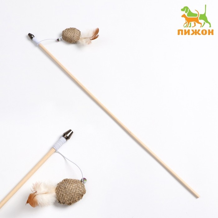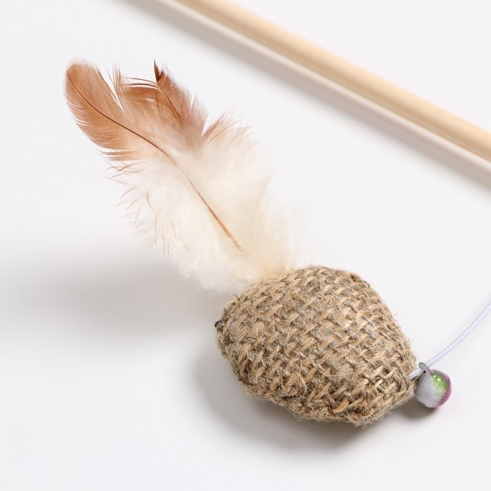 Дразнилка - удочка из эко-материалов "Шарик с кошачьей мятой и перьями" на деревянной палочкой 915