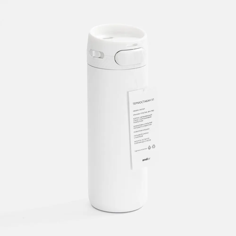 Специально спроектированная конструкция термостакана Andor со съемной кнопкой и отверстием для подвеса на крышке открывает простор для различных вариантов кастомизации и нанесения изображений. На изделии и упаковке нет айдентики бренда, а название бренда с картонного лейбла легко удалить.