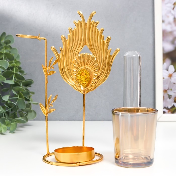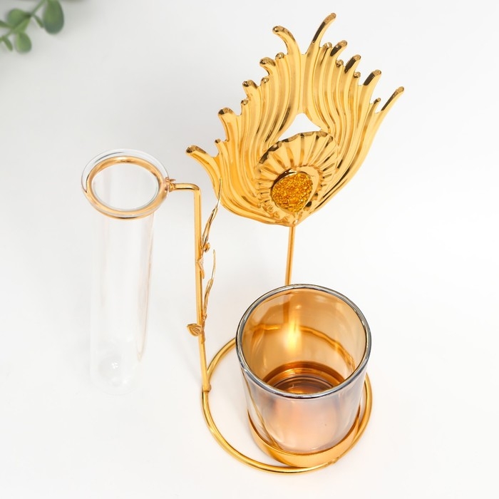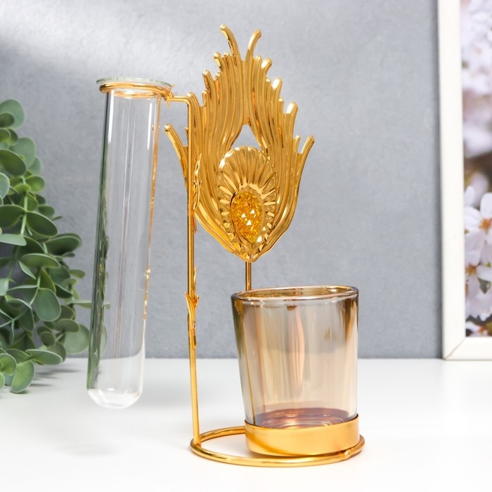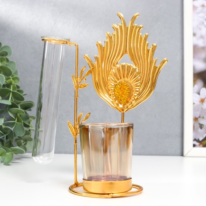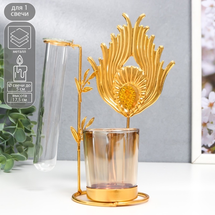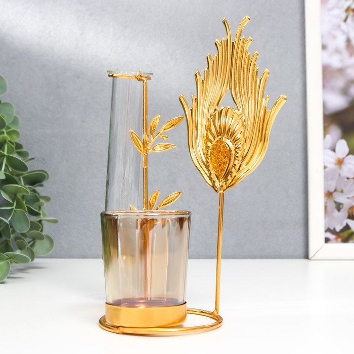 Подсвечник металл, стекло на 1 свечу с вазой "Золотое перо павлина" d-5 см, 7,5х12х17,5 см