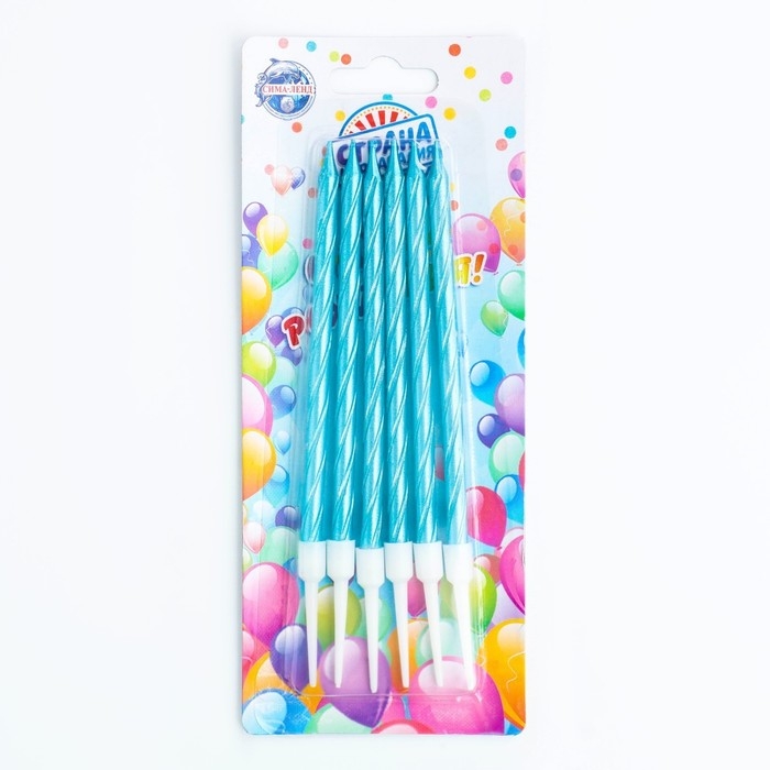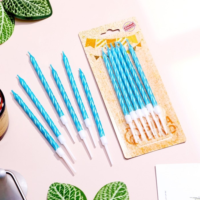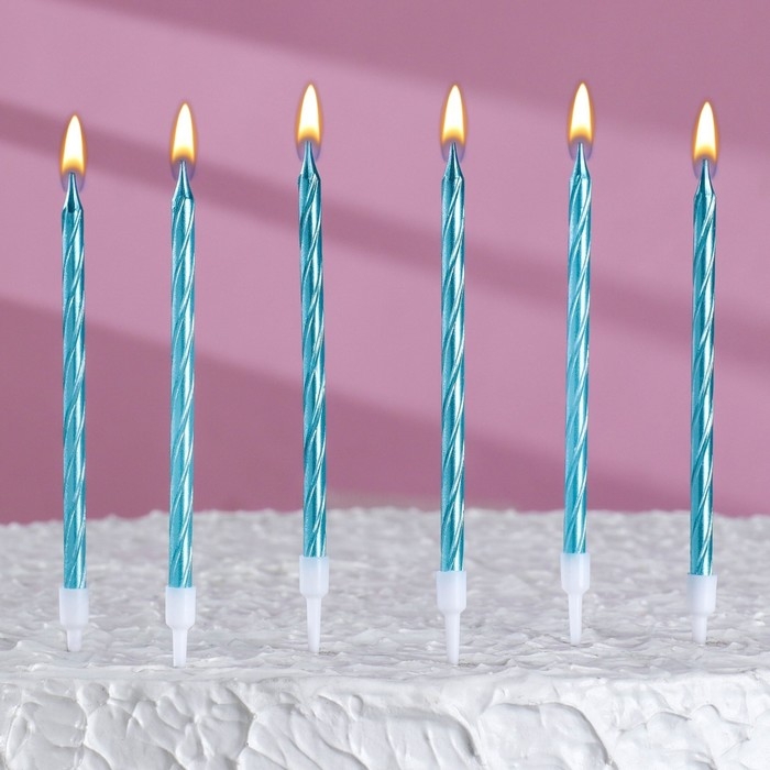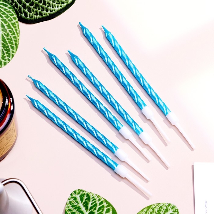 Свечи в торт витые с подставкой, 6 шт, 11 см, небесно-голубой