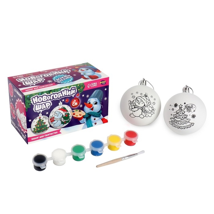 Ёлочные шары под раскраску на новый год «Исполнения желаний», d=7 см, 2 шт, краски, новогодний набор для творчества