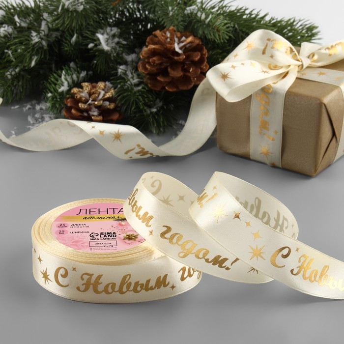 Новый год! Лента атласная с тиснением «С Новым годом!», 25 мм, 23 ± 1 м, цвет бежевый