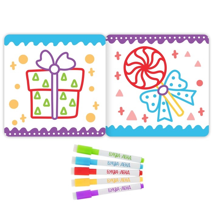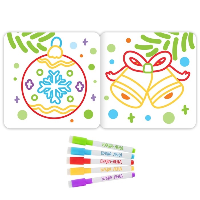 Многоразовая раскраска с маркерами поможет скоротать время перед долгожданным праздником! Раскрашивание атмосферных картинок точно развеселит ребёнка, а также потренирует его воображение, наблюдательность и мелкую моторику!