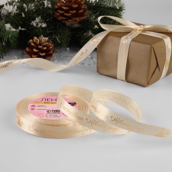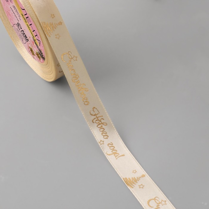 Новый год! Лента атласная с тиснением «Счастливого Нового года!», 15 мм, 23 ± 1 м, цвет бежевый/золотой №002
