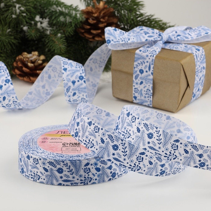 Новый год! Лента репсовая «Веточки», 25 мм, 23 ± 1 м, цвет белый/синий №001