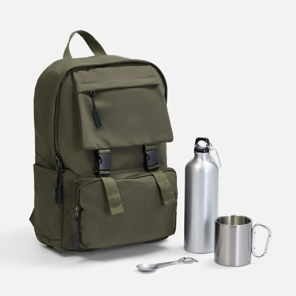 рюкзак - нейлон; кружка - пищевая сталь, 304, внутри - нержавеющая сталь, 201; бутылка - алюминий; столовый прибор - нержавеющая сталь, 420