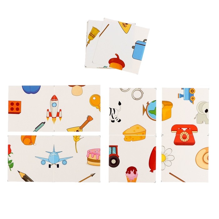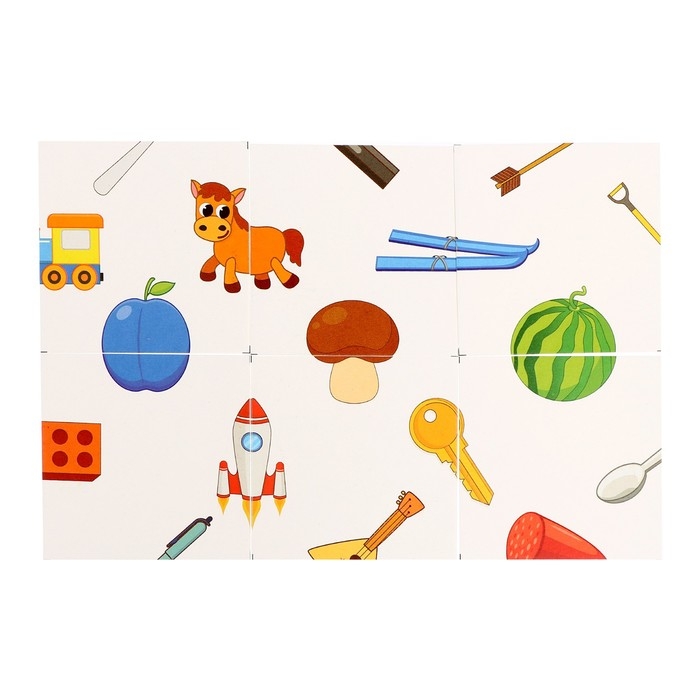 - Задача малыша — составить из половинок целые предметы и назвать их вслух.