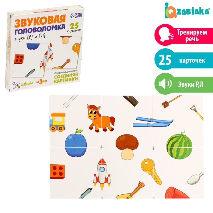 Развивающий набор «Звуковая головоломка» поможет малышу потренировать произношение звуков «Р» и «Л», речь, а также мышление и внимательность. Внутри вы найдёте 25 карточек с заданиями.