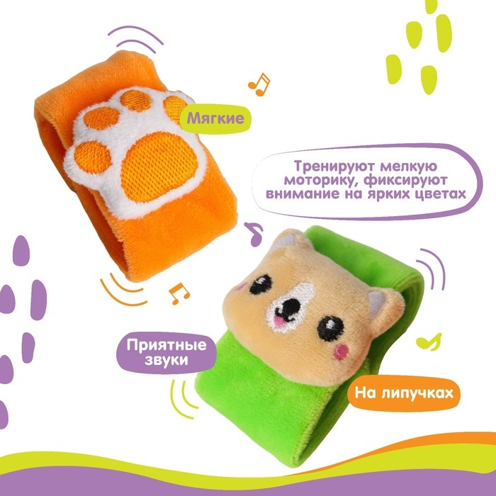 Развивающая игрушка выполнена в виде браслетика на липучке. В комплект входят две штуки. Их можно надеть малышу на ручки или ножки. Звуковые элементы будут греметь, когда непоседа сменит положение тела.