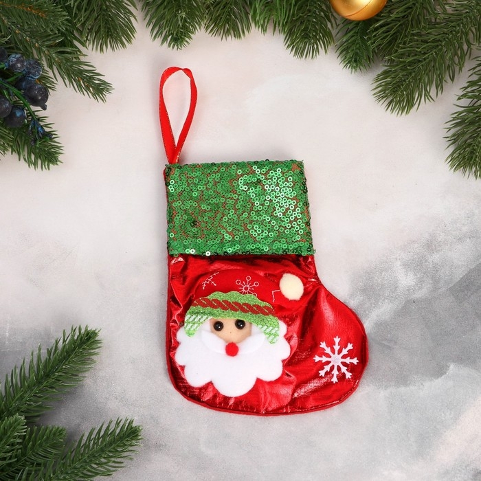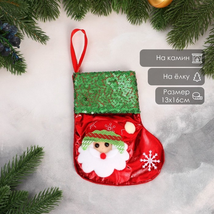 Носок для подарков "Дед Мороз блеск, снежинка" 13х16 см, красно-зелёный