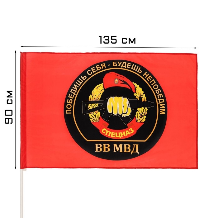 Флаг Спецназа ВВ МВД представляет собой прямоугольное полотнище красного цвета с эмблемой в виде стилизованного изображения правой руки, сжимающей автомат Калашникова и увенчанная краповым беретом.