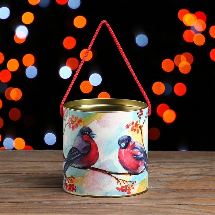 Новый год. Подарочная коробка, тубус «Снегири с рябиной» 120 х 120 мм (100 мм внутр. высота).