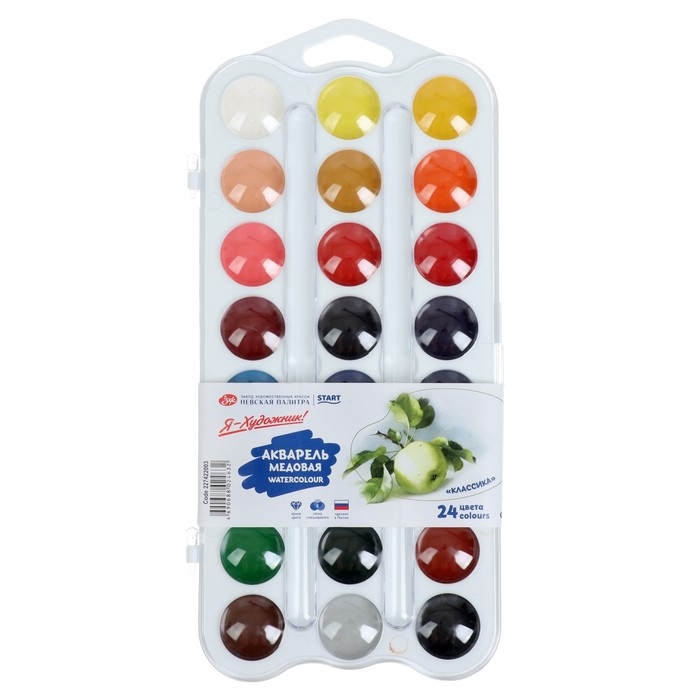 В составе набора медовой акварели 24 базовых цвета. Набор выпускается в пластиковом пенале небольшого размера, что позволяет значительно экономить место в рюкзаке. Крышку упаковки можно использовать в качестве палитры. Поскольку производителем является признанный лидер в производстве профессиональных художественных материалов, акварельные краски "Я-Художник!" отличаются высокой чистотой цвета и яркостью. Даже при нанесении тонкого слоя краски цвет рисунка получается ярким, и что особенно важно для детей – не меняет свой цвет после высыхания. Краски легко набираются на влажную кисть и легко разносятся, ровно ложатся на бумагу. Тонкость перетира пигмента обеспечивает нанесение краски без образования точек и пятен. После высыхания краски не растрескиваются вне зависимости от толщины нанесенного слоя.