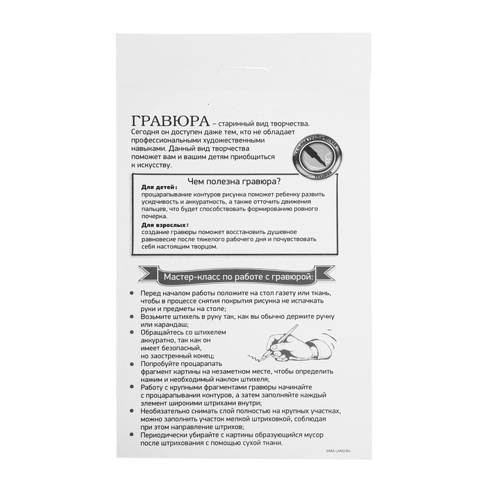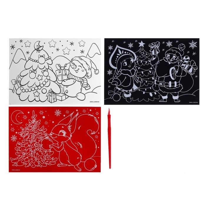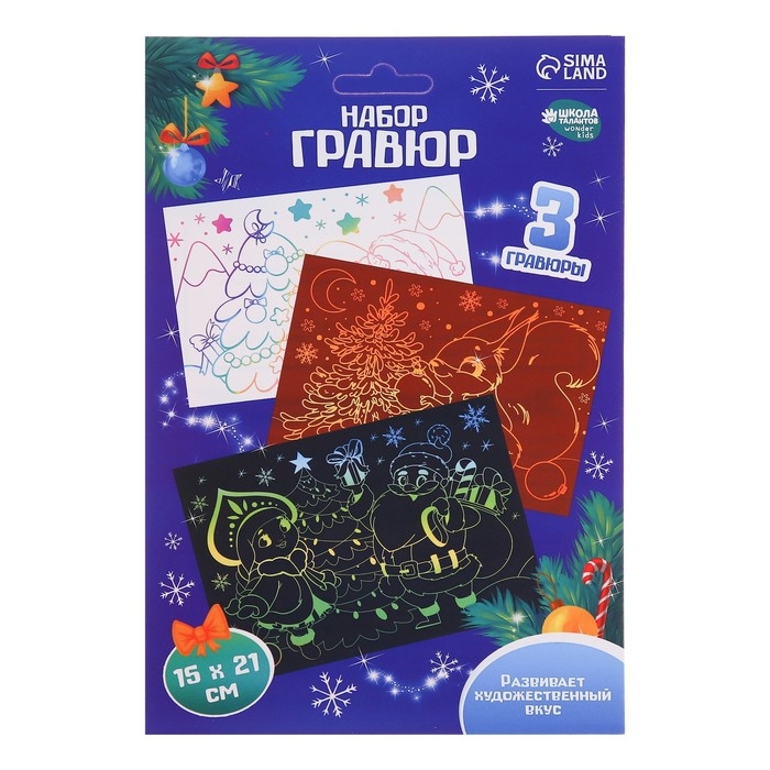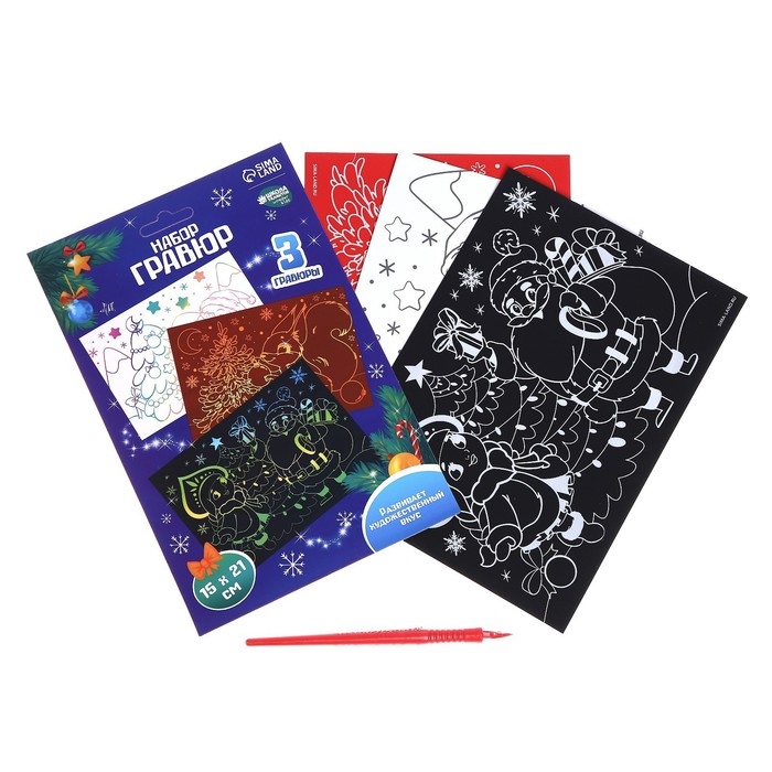 Чтобы создать новогоднюю гравюру, достаточно процарапать намеченные контуры рисунка специальным инструментом — штихелем (входит в набор). Дети будут с удовольствием соскребать верхний слой картины по контурам рисунка, под которым находится сияющая фольга! В наборе есть гравюры с разным основанием: голографическим, золотым и радугой.