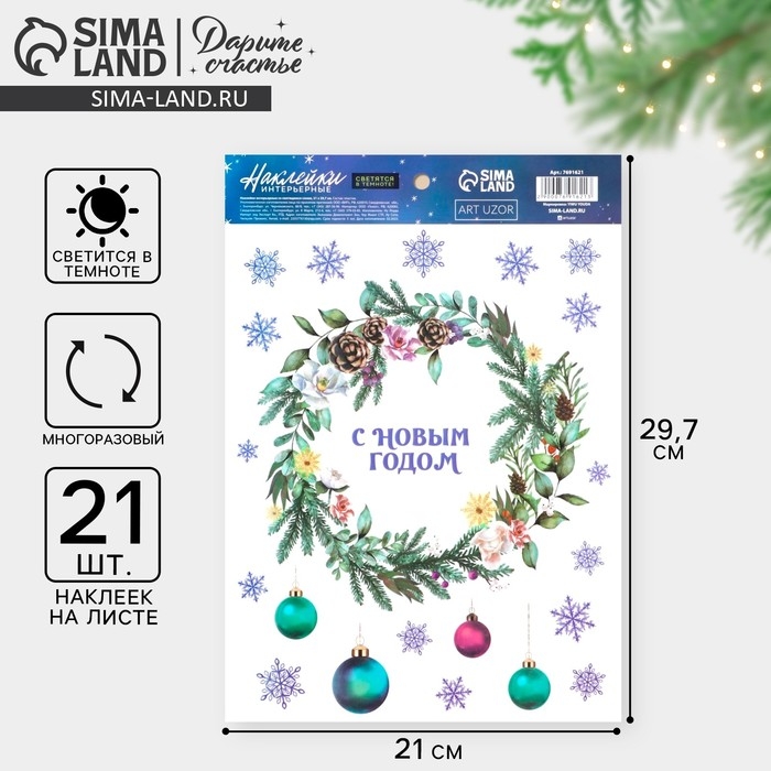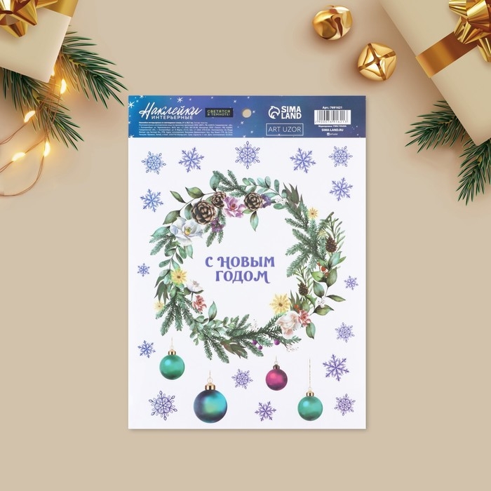 Наклейки новогодние, интерьерные со светящимся слоем «Новогодний венок», 21 х 29,7 х 0,1 см, Новый год