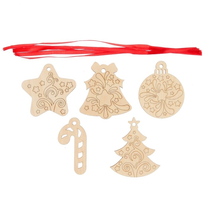 - В наборе 5 деревянных фигурок и ленты для подвесов.