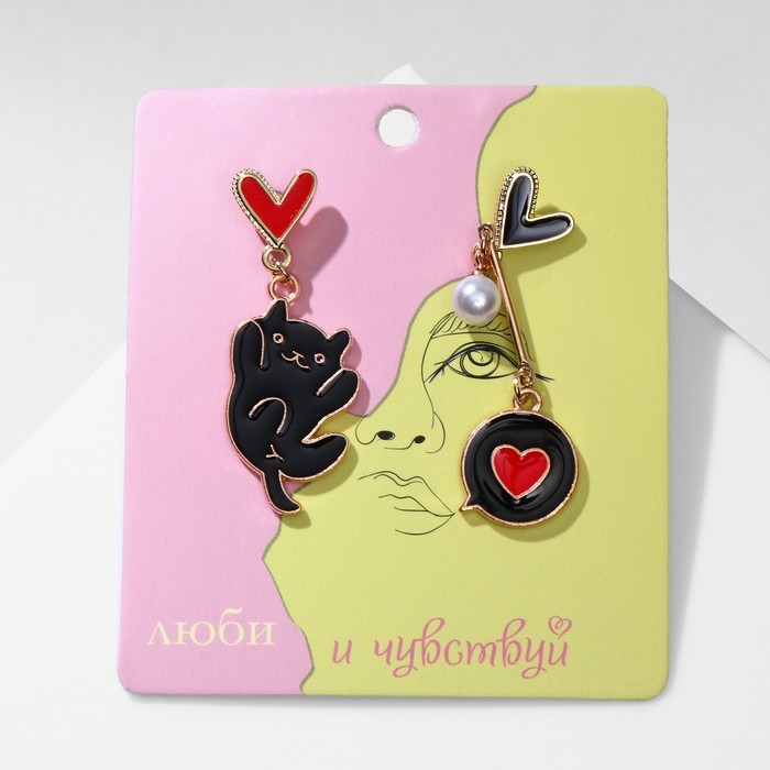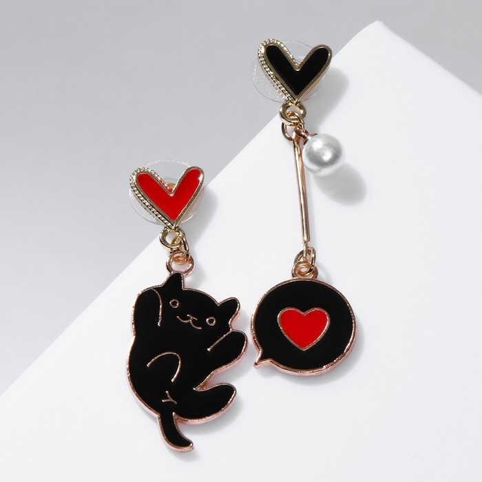 Серьги с эмалью «Котик» с сердечками, цвет чёрно-красный в золоте