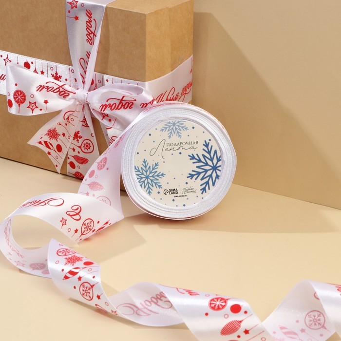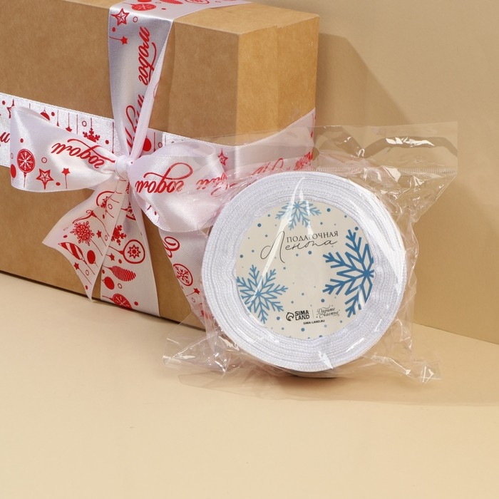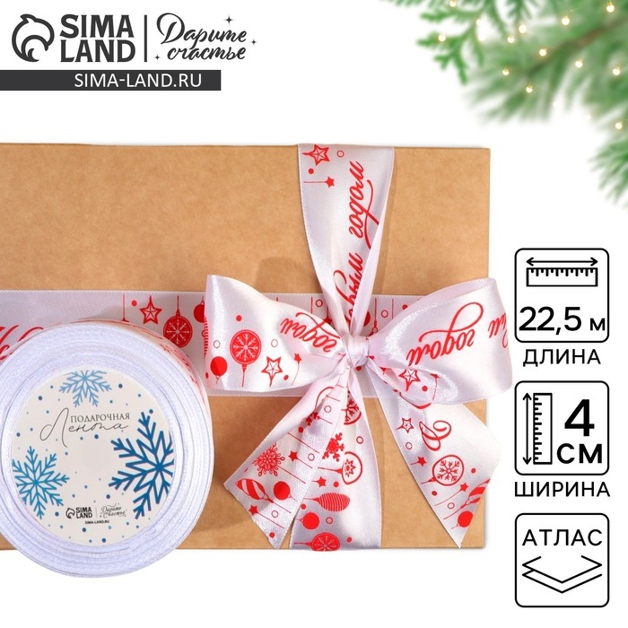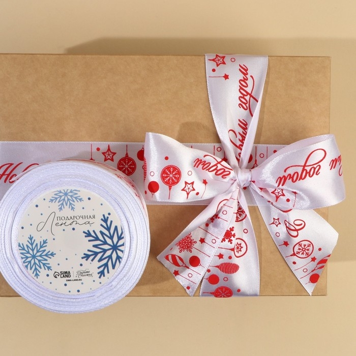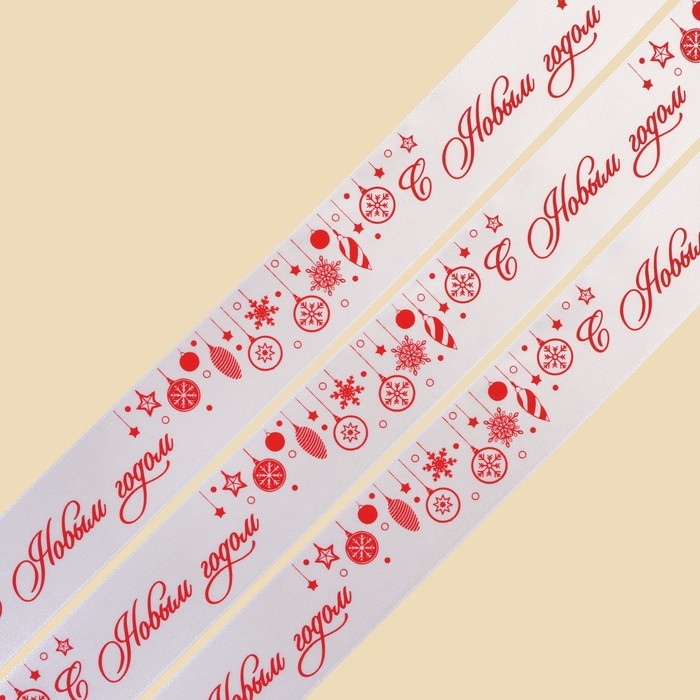 Лента атласная «С Новым годом», белая, 4 см х 22.5 м