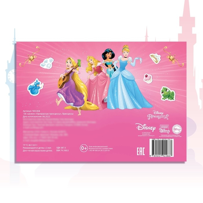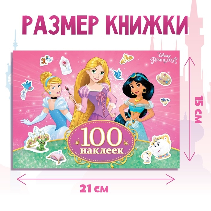 - В альбоме представлено 100 тематических наклеек с красочными изображениями героев из мультфильмов «Рапунцель», «Золушка» и «Алладин».