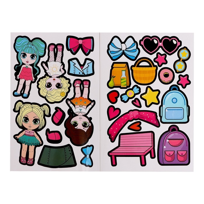 - Внутри ребенок найдёт 6 куколок-основ и 115 стикеров для создания разных образов.