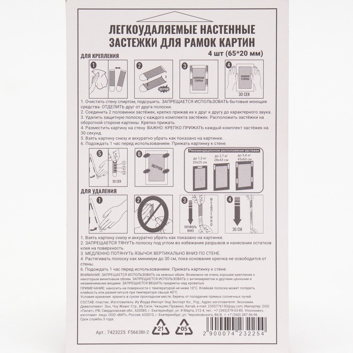 С помощью клейкие застежки Мой выбор ( липучки, крючки на стену, крепеж, полоски) можно легко и безопасно крепить разнообразные аксессуары на вертикальной поверхности. Вы не портите стены, не шумите, не сверлите, никаких лишних движений. При необходимости можно удалить, потянув за клейкую полоску. Благодаря настенным застежкам можно эстетично крепить к стене все что угодно соблюдая весовую нагрузку - роутер, часы, полки, рамки, картины. Одна застежка фиксируется на стене, а другая - на раме. Именно поэтому Вы можете вешать и снимать Ваши фотографии, предметы интерьера столько раз сколько пожелаете. Соблюдайте инструкцию по применению на оборотной стороне упаковки! Подходит для твердых, ровных поверхностей и окрашенных стен. Не подходит для бумажных или виниловых обоев, шероховатых поверхностей.