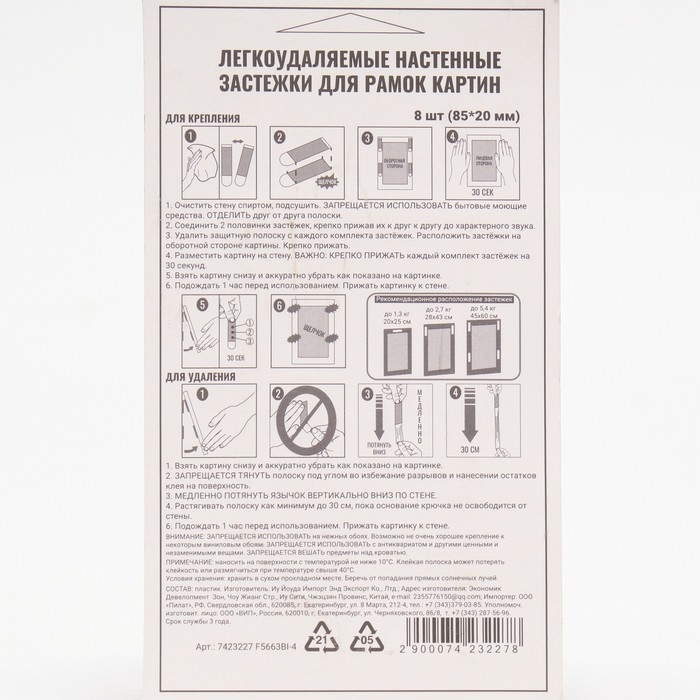 С помощью клейкие застежки Мой выбор ( липучки, крючки на стену, крепеж, полоски) можно легко и безопасно крепить разнообразные аксессуары на вертикальной поверхности. Вы не портите стены, не шумите, не сверлите, никаких лишних движений. При необходимости можно удалить, потянув за клейкую полоску. Благодаря настенным застежкам можно эстетично крепить к стене все что угодно соблюдая весовую нагрузку - роутер, часы, полки, рамки, картины. Одна застежка фиксируется на стене, а другая - на раме. Именно поэтому Вы можете вешать и снимать Ваши фотографии, предметы интерьера столько раз сколько пожелаете. Соблюдайте инструкцию по применению на оборотной стороне упаковки! Подходит для твердых, ровных поверхностей и окрашенных стен. Не подходит для бумажных или виниловых обоев, шероховатых поверхностей.