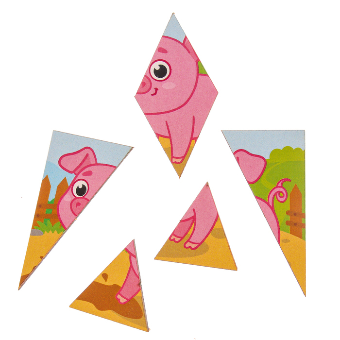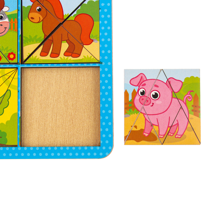 Задача малыша - собрать квадраты из цветных элементов: треугольников, прямоугольников и других фигур в рамку. Сначала можно собирать изображения с животными,а затем однотонные картинки.